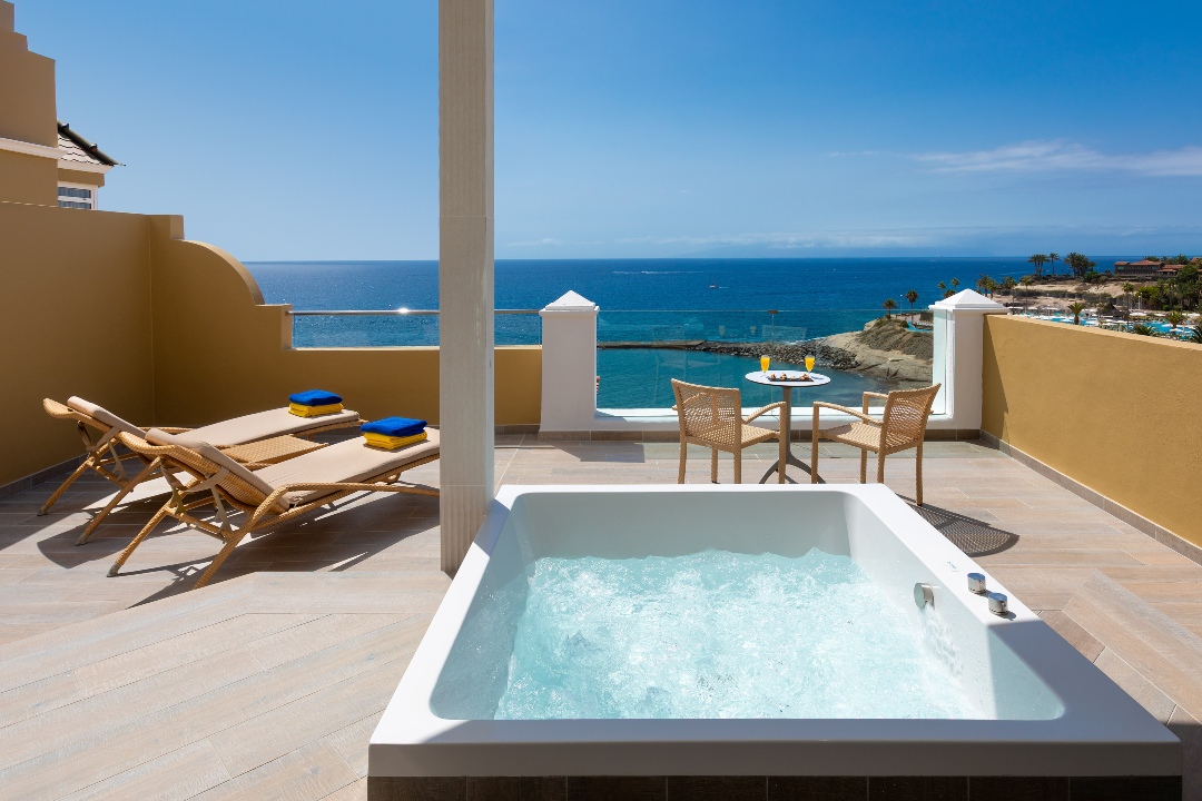 Terraza o balcón equipado con jacuzzi exterior y mobiliario de exterior, incluyendo cómodas tumbonas y sombrillas para tu relajación al aire libre.