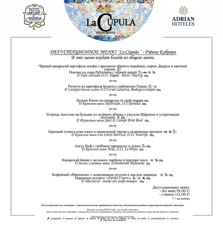 Шеф-повар ресторана, Рубен Кабрера, объединил лучшие традиции французской и канарской кухни, чтобы порадовать гостей уникальными блюдами, которые можно попробовать в нашем дегустационном меню.